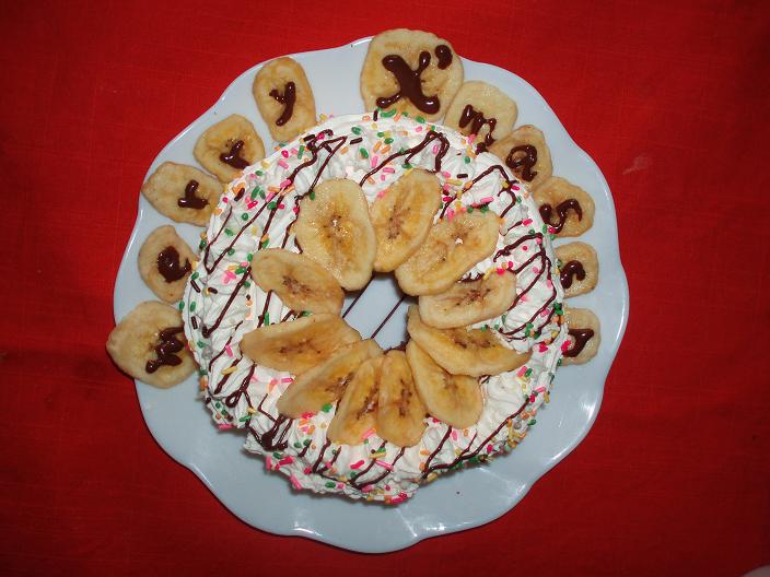 ケーキは無印のシフォンケーキの材料で作って、生クリーム、バナナチップ、チョコでトッピング。